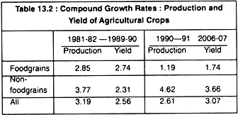 Growth rates of food grains and non-food grains production over the period 1991-92 to 1999-2000 and 2000-01 to 2006-07 have declined significantly. Average growth rales of area of food grains and non-food grains between 1994-95 and 2006-07 stood at 0.14 p.c. and 0.86 p.c. respectively. This may be attributed to growing slackness in agricultural public investment.