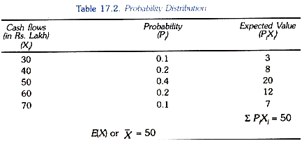 In the data given in Table 17.2 regarding 5 possible cash flows from an investment project, the expected value is obtained by multiplying the possible cash flows with their associated probabilities and then adding them. This we have done in the last column of Table 17.2 whose sum yields 50. Thus