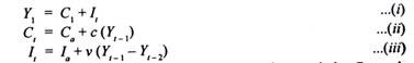 where Yt, Ct, it stand for income, consumption and investment respectively for a period t, Ca stands for autonomous consumption, Ia for autonomous investment, c for marginal propensity to consume and v for the capital-output ratio or accelerator.