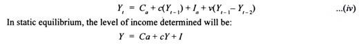 This is due to the fact that in static equilibrium, given the data of the determining factors, the equilibrium level of income remains unchanged, that is, in this case, Yt = Yt-1 = Yt-2 = Yt-n so that period lags have no influence at all and accelerator is reduced to zero. Thus, in a dynamic state when autonomous investment changes, the equation (iv) describes the path which a disequilibrium system follows to reach either a final equilibrium state or moves away from it. But whether the economy moves towards a new equilibrium or deviates away from it depends on the values of marginal propensity to consume (c) and capital-output ratio v (i.e., accelerator).