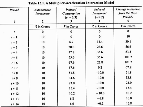 How the interaction between the multiplier and accelerator gives rise to the cyclical movements in economic activity (as measured by income or output) will become clear from Table 13.1. In formulating this table we have assumed that marginal propensity to consume (c) being equal to 2/3 or 0.66 and capital-output ratio (v) or accelerator being equal to 2.