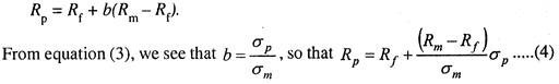 Suppose, the stock market’s expected return is 12%. Treasury Bills pay 4%, and b = 1/2. Then Rp = 8%. How risky is this portfolio? The riskiness can be measured by the variance of the portfolio’s return. Let us assume the variance of the risky stock market investment is σ2m and the standard deviation is σm. We can show that the σ of the portfolio is the fraction of the portfolio invested in the risky asset times the o of that asset: σp = bσm……… (3)