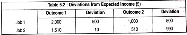 The two jobs have the same expected income because .5 (£2,000) + .5 (£1,000) = .99 (£1,510) + 0.1 (£510) = £1,500. But the variability of the possible payoffs is different for the two jobs. The variability can be analysed by a measure that presumes that large differences between actual payoffs and the expected payoff, called deviations, signal greater risk.