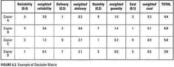 The simplest way of achieving this aim is to rank each alternative on each decision criterion. However, ranks can be very deceptive. It is better to use a common scale (usually a 1-9 scale). These ratings are multiplied by the weighting to produce a decision matrix. For example, Figure 6.2 gives a decision matrix for the purchase of a photocopier.