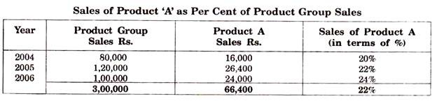 Suppose, that the forecast of product group sales for 2007 are Rs. 1,50,000. For calculating the forecast sales of product A, we can take either percentage revealed by the trend (which in this case would be 26 assuming that the same growth trend continuous) or the average percentage which would be 22. Sales forecast for product A on the basis of average percentage is Rs. 33,000 and on the basis of 26% is Rs. 39,000.
