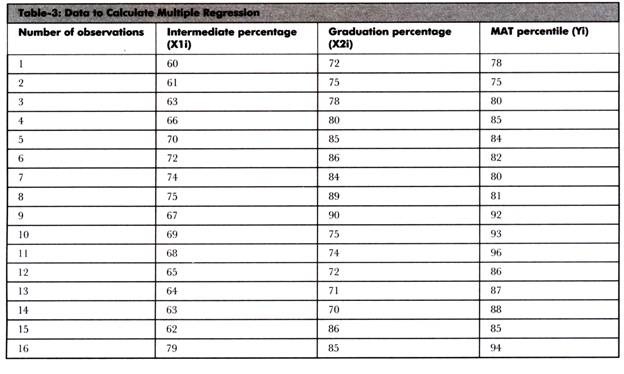 Let us learn to calculate multiple regression with the help of an example. Suppose the researcher wants to study the relationship between intermediate percentage, graduation percentage, and MAT percentile of a group of 25 students.