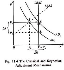 In contrast the classical model is based on the assumption that output remains fixed at the full employment level and price adjusts in response to changes in aggregate demand. The comparison is shown in Fig. 11.4. If the aggregate demand curve shifts to the left, in the short run output falls to Y0, price remaining the same at P0. But in the long run price P0 to P1 output remaining the falls from same.