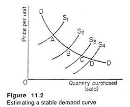 It is clear that each price/quantity point represents the intersection of the supply and demand curves. Since all the demand determinants except price are assumed to be stable, points A, B, C and D must be on the same demand curve. So the demand curve DD can be estimated by connecting the four points.