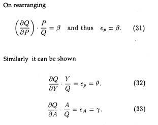 These elasticities, income elasticity of demand (ey), advertisement elasticity of demand (eA) and price elasticity of demand (ep), are constant. The values, θ, y and β are not functions of the variables; for instance, y does not change with changes in P, Q, Y or A.
