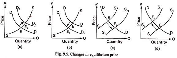 From our discussion so far we discover four possibilities for change in market price as Fig. 9.5 shows. In this figure we consider all the four possibilities of changes in demand and supply.