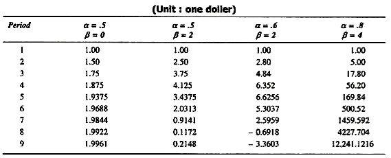4. α= 0.6, β = 2—This gives us explosive cycles with variations about the multiplier level becoming large and large. (Region C in the diagram 42.3).
