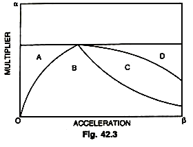 1. α = 0.5 and β = 0—This gives us purely multiplier effects with income approaching the peak. Here the acceleration coefficient is zero (Region A in the diagram 42.3). This is the case of fluctuations having multiplier effect only; where income approaches asymptotic level.