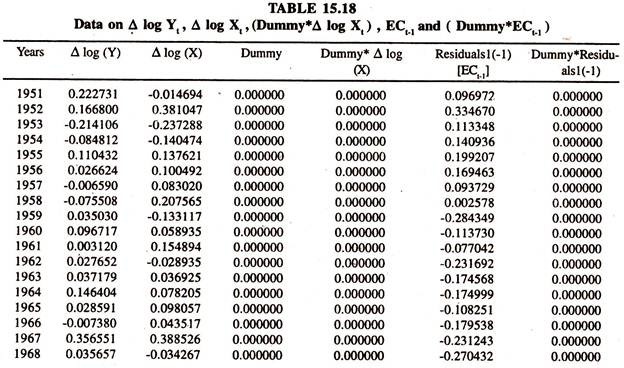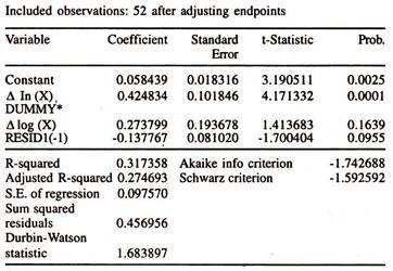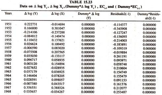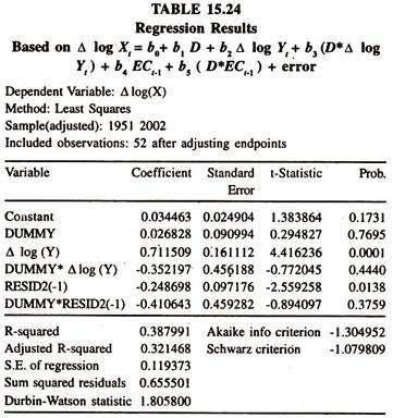The results of the ECM show that the differential coefficient of an interaction variable [DUMMY* A log Xt ] is also found to be statistically insignificant. Therefore deleting an interaction variable as well the ECM is fitted to the data.The results of the same are given in table 15.22.
