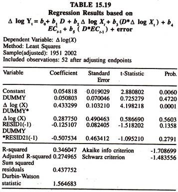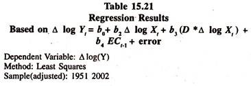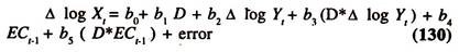 Δ log Yt = b0+ b1 D + b2 Δ log Xt + b3(D*Δ log Xt) + b4 ECt-1 + b5 ( D*ECt-1) + error……………… (129)