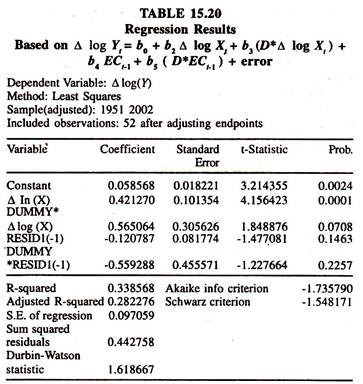 Since the coefficient of dummy variable [differential intercept] is found to be statistically insignificant, the ECM is fitted to the data by deleting this variable [D] from the model. The results of the same are given in table 15.20.