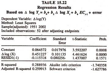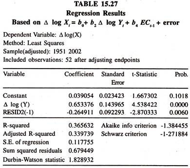 The results of the model show that the differential coefficient of the error correction term is found to be statistically insignificant. Therefore deleting the interaction variable as well the ECM is fitted to the data. The results of the same are given in table 15.21.