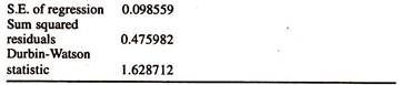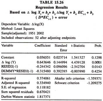 The regression results of ECM show that the coefficient of interaction variable [D* Δ log Y ] is insignificant. Therefore the ECM is fitted by deleting the interaction variable. The results are given in table 15.26