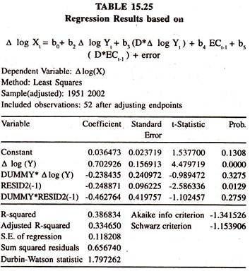 Since the coefficient of dummy variable is found to be statistically insignificant, the ECM is fitted by deleting this variable [D] from the model. The results of the ECM are given in table 15.25