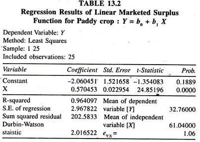 The regression results of the linear marketed surplus function [Table 13.2] illustrate that the regression coefficient of output of paddy, constant marginal propensity to sell [dY/dX], is appreciably positive.