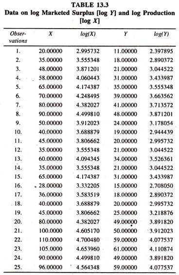 The above function will also be estimated by OLS method. The derivative of log Y with respect to log X, d log Y/d log X, is b1. This value directly gives the numerical value of production [output] elasticity of marketed surplus [constant elasticity of marketed surplus with respect to production]. On the basis of size of b1, [more than unity or less than unity or unity,] the degree of responsiveness of marketed surplus to the changes in production can be understood.