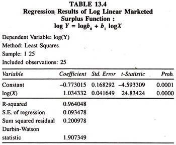 The data [Table 13.3] on log marketed surplus [7] and log production of paddy have been used to fit the log linear marketed surplus function. The regression results of log linear marketed surplus function for paddy crop [Table 13.4] show that the regression coefficient of output of paddy, which is constant output elasticity of marketed surplus, is significantly positive.