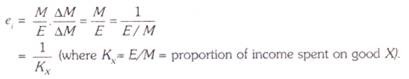 It is easy to show that when whole of the increase in income is spent on any good X, then income elasticity is equal to the reciprocal of the proportion of income spent on the good, that is, 1/Kx.