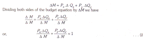 The above equation implies that the sum of the proportion of increase in income spent on good X (i.e. Px ∆Qx /∆M) and the proportion of increase in income spent on good Y (i.e. Py∆Qy /∆M) must be equal to one. Multiplying the first term on the left side of equation (i) by Qx/Qx and M/M and multiplying the second term by Qy/Qy and M/M, we have