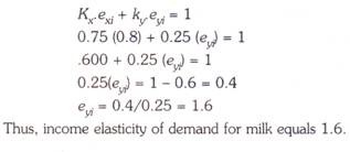 Thus, on the average, consumption of goods must increase by the same proportion as income. If there are two goods X and Y, then the above equation Kx exi + Kyeyi = 1 must hold. This equation implies that given the two goods on which a consumer spends his income, if we know the proportion of income spent of one good and the income elasticity for that good, we can calculate the income elasticity of demand for the other good.
