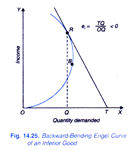 Engel curve bends backward and has a negative slope beyond a certain level of income as illustrated in Figure 14.25. It will be observed from figure 14.25 that an inferior good behaves like a necessity in the initial ranges of income and therefore the slope of its Engel curve is initially positive, and only after a particular level of income, it bends backward.