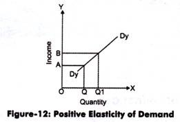 In Figure-12, the slope of the curve is upward from left to right, which indicates that the increase in income causes increase in demand and vice versa. Therefore, in such a case, the elasticity of demand is positive.