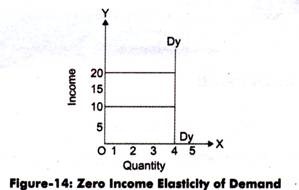 Figure-14 shows that when income increases from Rs. 10 to Rs. 20, then the demand for goods is remain same, 4 units. In Figure-14, the slope of the curve is parallel to Y-axis (income side), which indicates that the increase in income causes no effect in demand. Therefore, in such a case, the elasticity of demand is zero.