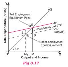 Suppose, the actual demand is for a level of output OM; (E1M1) which is less than full employment level of aggregate supply OM (or EM). The difference between the two, i.e., the actual aggregate demand E1M1 (or OM1) and aggregate supply at full employment EM (or OM) is EB which is a measure of deflationary gap or deficient demand. Mind, E1 is the under-employment equilibrium point.