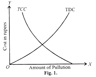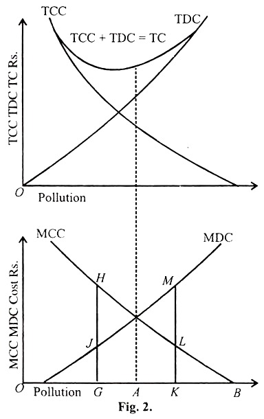 In the above expression pollution affects TCC and TDC. Hence minimize the TDC+TCC. The figure coming below Fig. 2.shows the optimum level of pollution by summing up the two cost curves and locating its minimum.