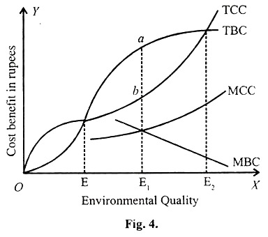 Another condition is that the MBC = MCC. This occurs where both the curves intersect each other at the point OE1 Again at any other point whether MBC will be greater than Environmental Quality MCC or MCC will be greater than MBC. So only at OE1the difference between TBC and TCC are maximum and the MCC = MBC. This occurs because at ‘ab’ the difference between TCC and TBC is maximum.
