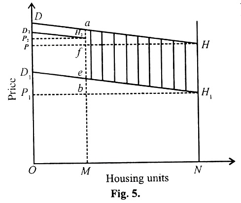 In the diagram (Fig. 5.) X-axis denotes the number of housing units and the Y-axis the price paid for it. DH is the demand curve for houses and the stock of houses is assumed to be fixed at ON. So the NH is the supply curve and the DH is the demand curve which intersects at H. the market price with the demand and supply curve is OP. Now consider that MN houses are affected by noise so the demand curve falls to the position D1H1. This leads to the fall in price of P1 for a noisy house.