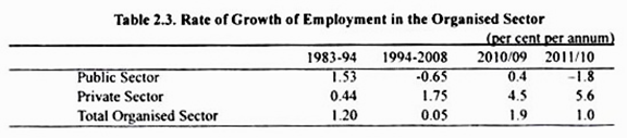 According to Approach to the 11th plan, worsening of unemployment situation was due to faster growth in labour force. However, in our opinion, the fact that there was decline in increase in employment in the organised sector despite of higher growth in GDP shows the ulter failure of the strategy of employment generation. Employment growth in the organised sector (both public and private combined) increased during the post-reform period 1994-2008 at the rate of only 0.05 per cent per annum as against 1.20 per cent during 1983-94 (see Table 2.3).