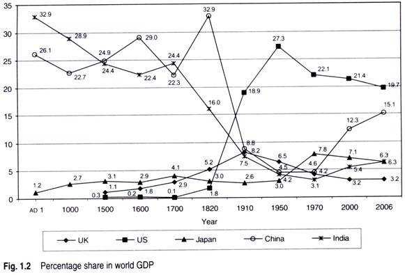 It was only after AD 1500 that some western economies, such as Italy, France, and Germany emerged with 4.7 per cent, 4.4 per cent, and 3.3 per cent share, respectively, in the world GDP whereas the UK and the US merely contributed 1.1 per cent and 0.3 per cent, respectively, of the world GDP (see Fig. 1.2). India and China continued to remain the two most dominant economies till the early nineteenth century.