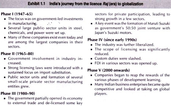 During the recent decades, most developing countries made a strategic shift from their restrictive trade and investment policies to economic liberalization. The transformation of the Indian economy from one following the import substitution strategy with a highly complex system of licenses and multiple procedures to an economy open to globalization is summarized in Exhibit 1.1.