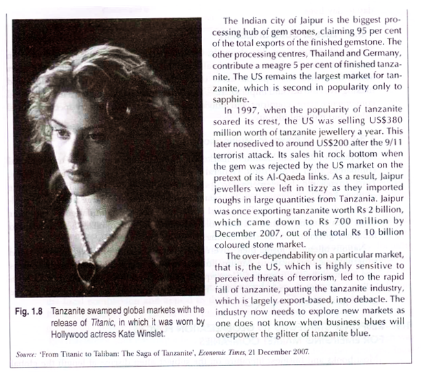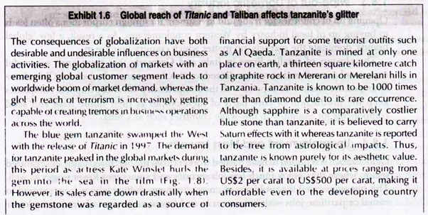 The global integration of economies has made markets highly vulnerable to external upheavals. For instance, the soaring popularity of the film Titanic in the US created a boom in the worldwide demand for the gem tanzanite whereas its subsequent association with a terrorist outfit drastically brought down its prices (see Exhibit 1.6).