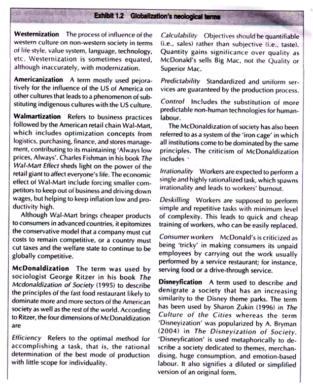 Moreover, a number of interesting terms to signify the various aspects of globalization, such as Westernization, Americanization, Walmartization, McDonaldization, Disneyfication, Coca-Colanization, etc., have also emerged, as given in Exhibit 1.2.