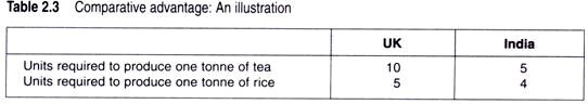 To illustrate the concept, let us assume a situation where the UK requires 10 units of resources for producing one tonne of tea and 5 units for one tonne of rice whereas India requires 5 units of resources for producing one tonne of tea and 4 units for one tonne of rice (Table 2.3). In this case, India is more efficient in producing both tea and rice. Thus, India has absolute advantage in the production of both the products.