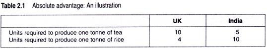 To illustrate the concept of absolute advantage, an example of two countries may be taken, such as the UK and India. Let us assume that both the countries have the same amount of resources, say 100 units, such as land, labour, capital, etc., which can be employed either to produce tea or rice.