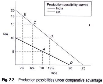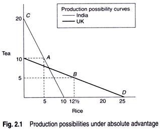 Suppose no foreign trade takes place between the two countries and each employs its resources equally (i.e., 50:50) for production of tea and rice. The UK would produce 5 tonnes of tea and 12.5 tonnes of rice at point B whereas India would produce 10 tonnes of tea and 5 tonnes of rice at point A as shovra in Fig. 2.1.