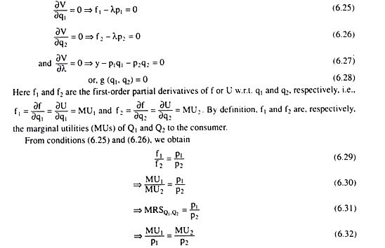 In (6.24) V is a function of q1, q2 and λ and the first order conditions (FOCs) of constrained utility-maximisation would be obtained if the first-order partial derivatives of V w.r.t. q1,q2 and λ equal to zero.