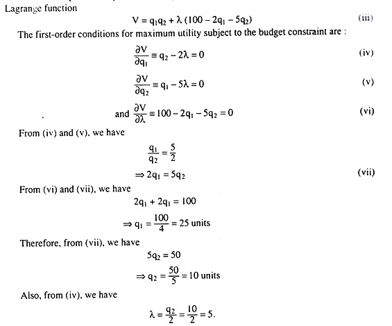 Therefore, it is obtained from the FOCs that the utility-maximising quantities of the goods are q1 = 25 units and q2 = 10 units.