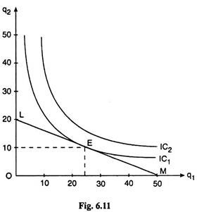 The example can be presented graphically with the help of Figure 6.11. The ICs in the given example are rectangular hyperbolas, as is evident from the utility function (i). Two such ICs, viz., IC1 and IC2, have been given in Figure 6.11.