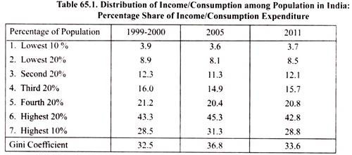 It will be observed from Table 65.1 that in the year 1999-2000 the top of 20 per cent of households in India had 43.3 per cent share of consumption expenditure, whereas bottom 20 per cent of population had only 8.9 per cent share of consumption expenditure in India. This shows the gross inequalities in consumption expenditure and therefore income distribution in the year 1999-2000.