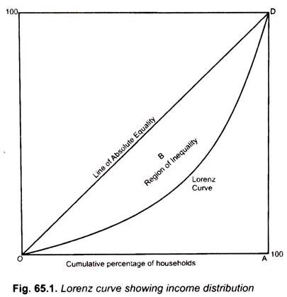 Straight diagonal line OD shows equal distribution of income according to which every household receives the same income and therefore Lorenz Curve representing perfect or absolute equality of income will be a diagonal line. When the distribution of income is less than perfect equality, Lorenz Curve will be below it, as shown by OD curve in Fig. 65.1. The line of perfect equality serves as a point of reference to which we compare actual or observed distribution of income in a society.