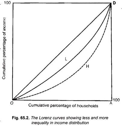 The maximum deviation of actual distribution from the line of perfect equality will be represented by the area of a triangle OAD in Fig. 65.2. According to Lorenz Curve criterion of income distribution, the farther the Lorenz curves to the line of absolute equality, the greater will be the inequality in the distribution of income. Thus in Fig. 65.2, the Lorenz curve H represents greater inequality in income distribution than Lorenz curve L.
