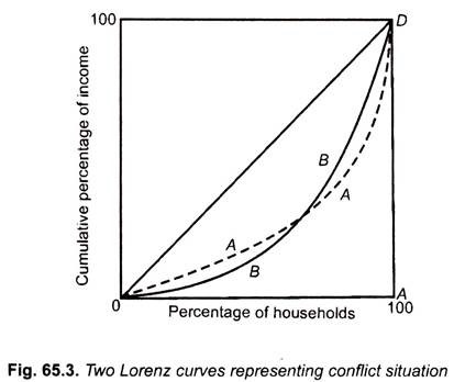 In Fig. 65.3, according to Lorenz curve A in the households at the bottom of income distribution there is more equality and in households with higher income levels the income distribution is more unequal. The opposite is case in Lorenz curve B in Fig. 65.3 where in the households at the bottom level there is more inequality while at the higher income level, income inequality is less. With the level of mean income being the same, the two Lorenz curves show different patterns of income distribution. The choice between such income distribution patterns represented by two Lorenz curves intersecting each other requires the resolution of conflict situations over which agreement regarding extent of inequality of income distribution may not be possible.